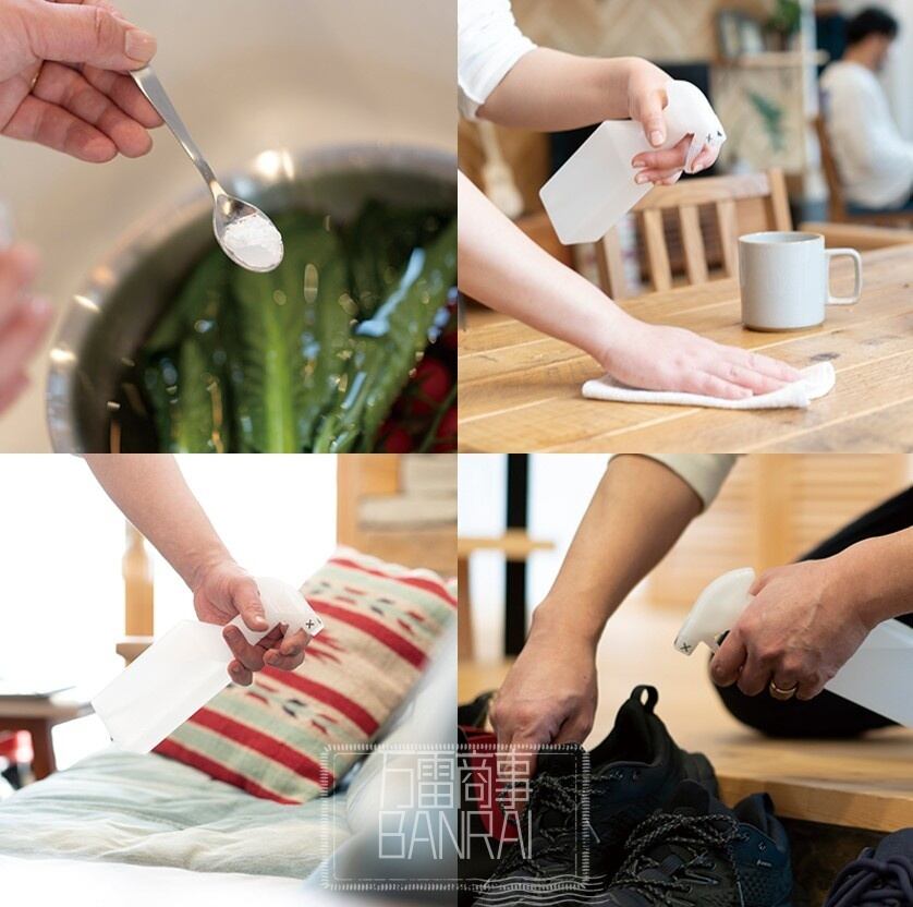 1Lの水に対し1gのパウダーを溶かした水溶液をスプレーで吹きかける、或いはふきん等に含ませて汚れを拭き取る。