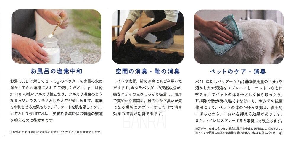 ホタテの抗菌作用でペットの体のかゆみを抑えて衛生的に保ち、においを消臭します。