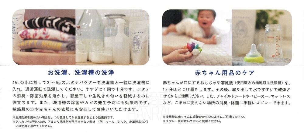 ※初めてご使用の際には、ホタテの洗浄力により洗濯槽の中の剥がれ落ちた汚れが洗濯物に付着する場合がありますので、お湯と5g程の粉で洗濯槽のお掃除をしてから衣類のお洗濯を始める事をおすすめします。