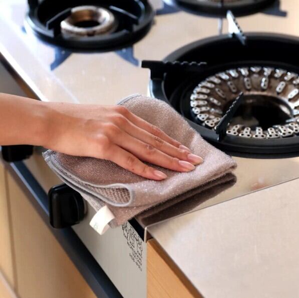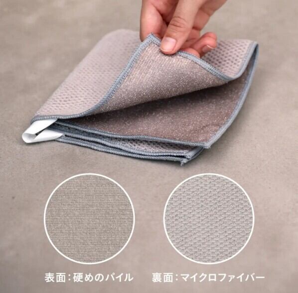 ●表面は硬めのパイル生地なので、水で濡らしてこするだけでこびりついた汚れや水垢、石鹸汚れをスルスル落とせるキッチンクロスです。